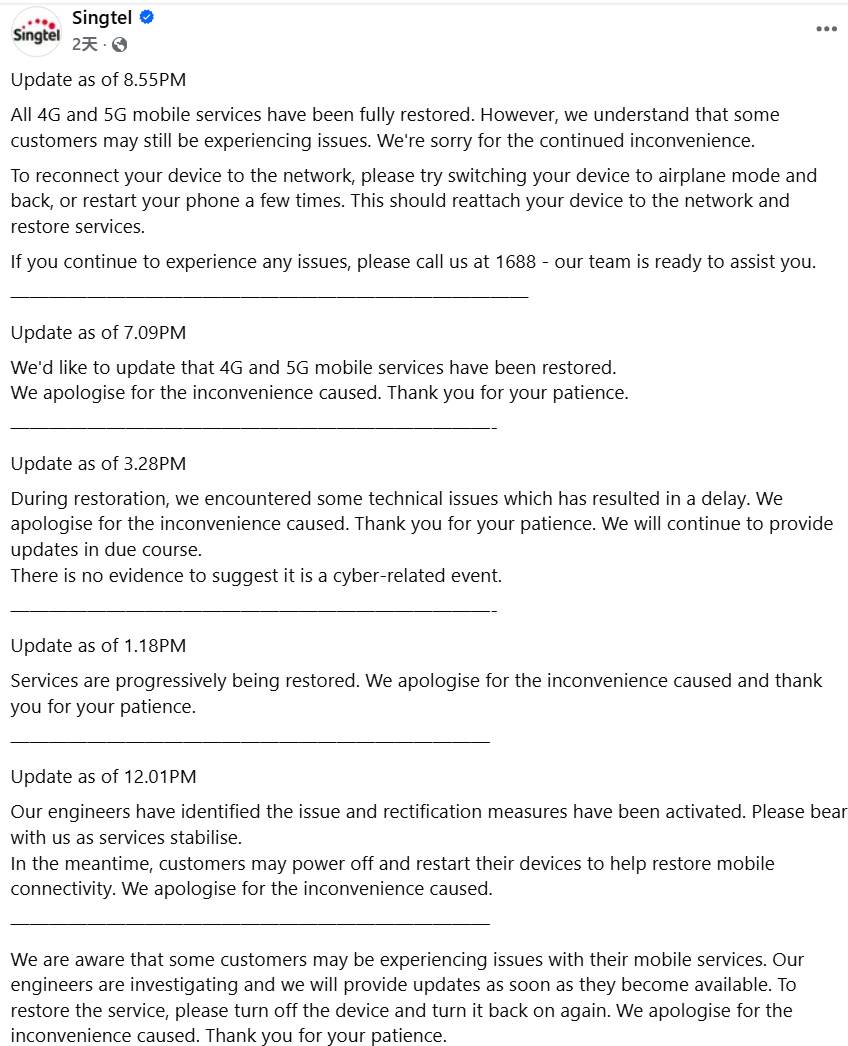 新电信工程师在中午确认问题成因并启动修复,但恢复过程并不顺利。直至当晚7时09分,才宣布4G和5G服务全面恢复。
