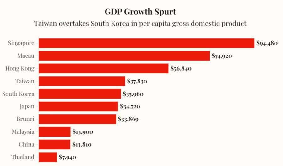 再看看亚洲各地的排名。紧随新加坡的是中国澳门(约7.5万美元)、中国香港(约5.7万美元)、中国台湾(约3.8万美元)。
