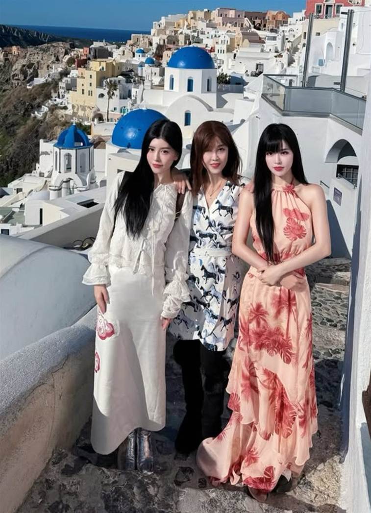 照片中,可以看到BY2和妈妈开心地站在蓝顶白墙教堂钟楼前,以及能俯瞰纯白建筑、湛蓝海景的阶梯上合影留念。 Yumi身穿碎花长洋装,Miko穿着全白蕾丝上衣和长裙,仙气十足,站在中间的妈妈则穿着一件白底蓝色马匹图腾的洋装,展现优雅气质。