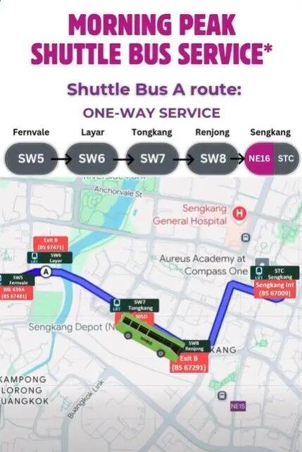 两条线路分工明确:早高峰A线从早上6点到10点运行,从芬薇站出发,途经拉雅站、同港站、仁宗站,最终抵达盛港巴士转换站;晚高峰B线则从傍晚5点半到晚上9点半,从盛港巴士转换站出发,途经振林站、农道站、古邦站和丹甘站。