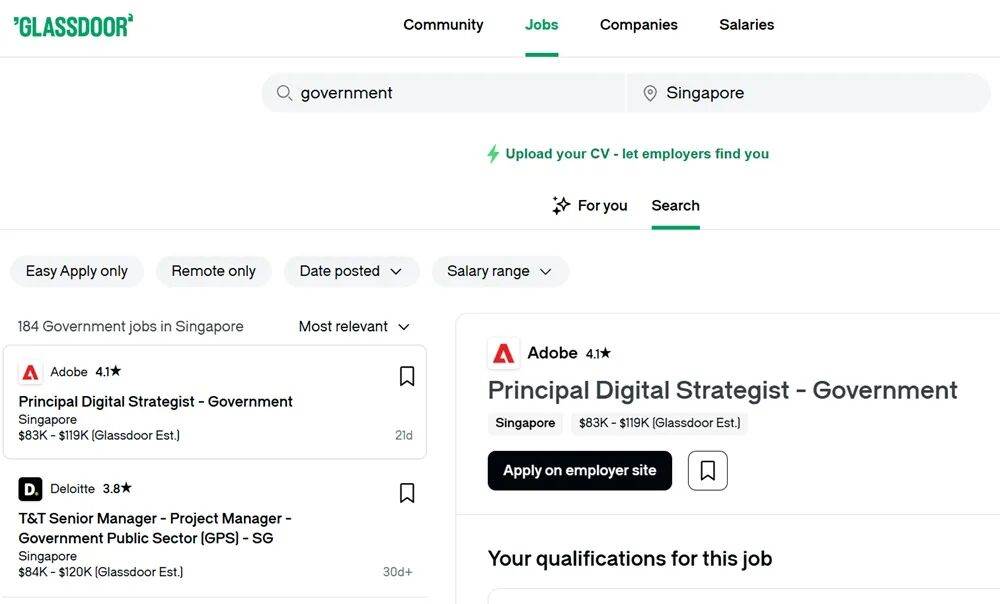 Glassdoor 网站除了让用户申请工作,也包括用户提供的公司和薪金相关资讯。(截图)