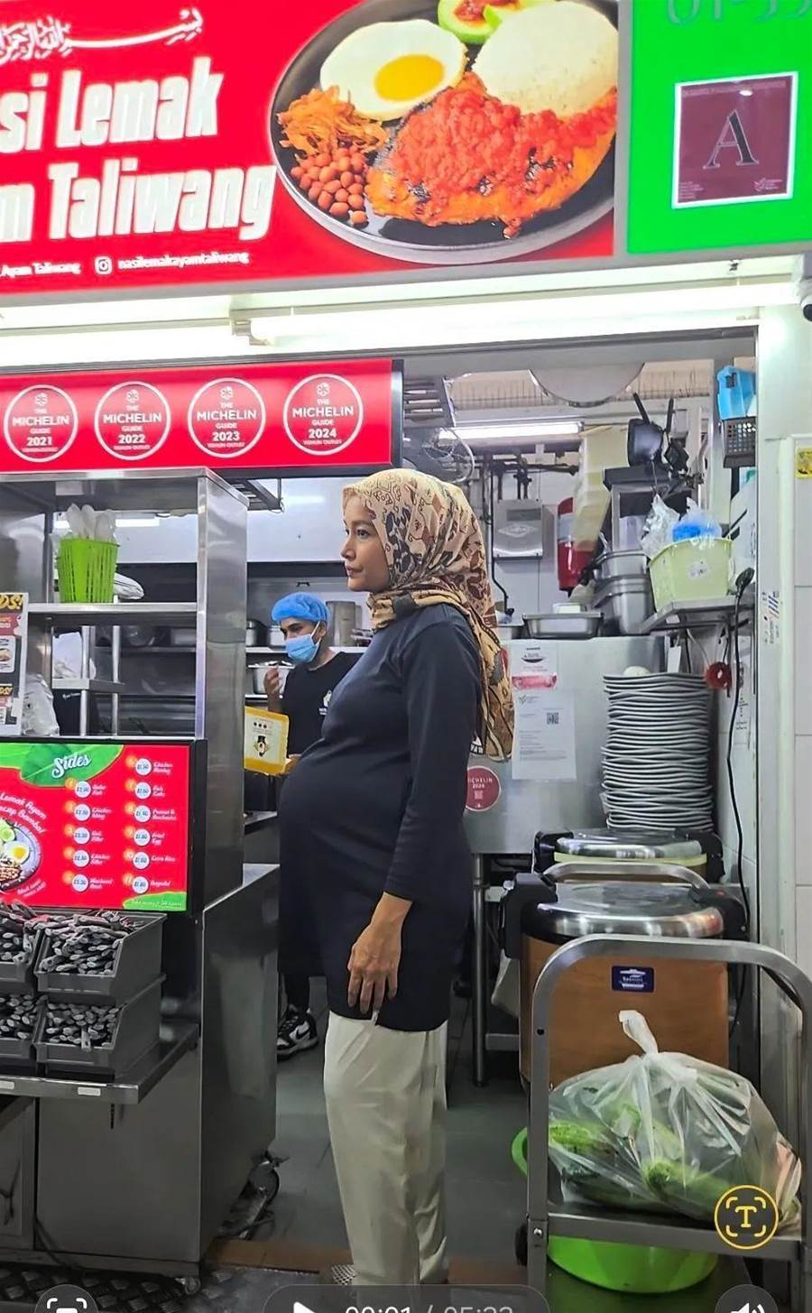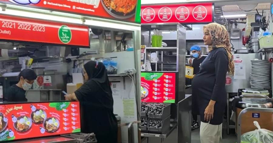 位于义顺公园小贩中心的Nasi Lemak Ayam Taliwang,右图为摊主孕妻站在摊位前。(Noorman Mubarak脸书/谷歌)