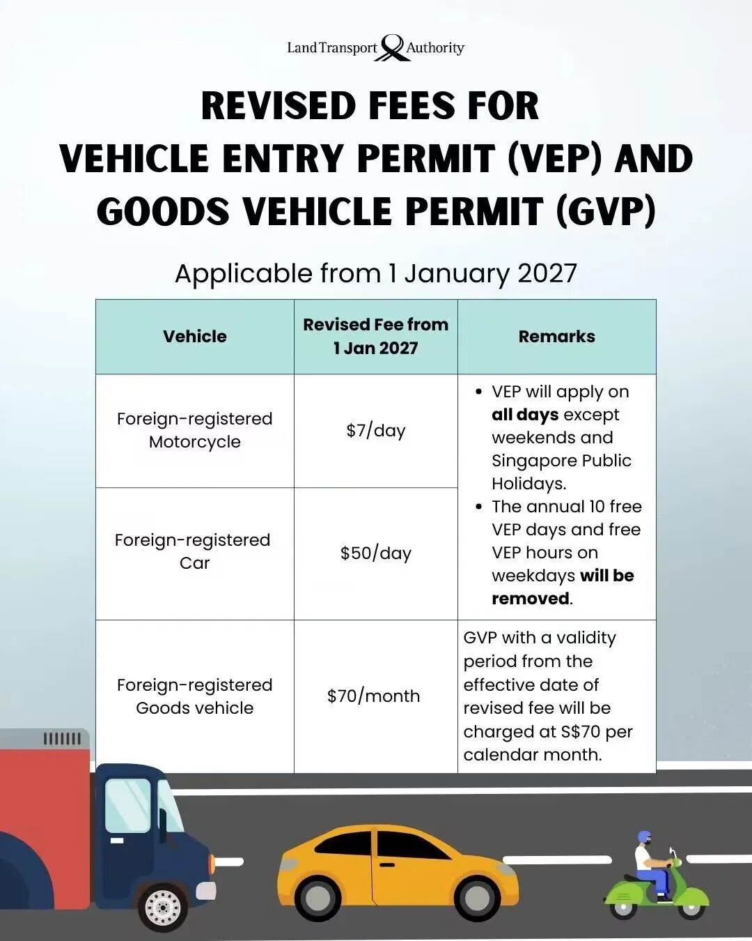 根据新规,外国私家车的每日入境许可费(VEP)将从目前的35新元提高至50新元,摩托车则从每日4新元上调至7新元。