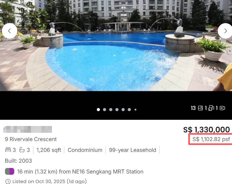 3)中央区以外(OCR)公寓价格普遍更低,尺价1500新币左右就能找到不错的房源,甚至还有一些挂牌公寓的尺价才1000新币出头: