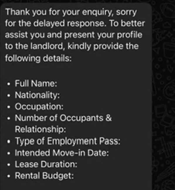 面对Rachel的咨询,罗恩的回复显得十分 “专业”:他先为延迟回复致歉,随后要求Rachel提供全名、国籍、职业、入住人数及关系、准证类型、计划入住日期、租期、租金预算等信息,称 “需整理成资料提交给房东,以便推进租房流程”。
