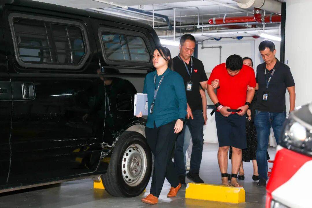 警方在早上11时15分左右,将被告押回车上,离开酒店。