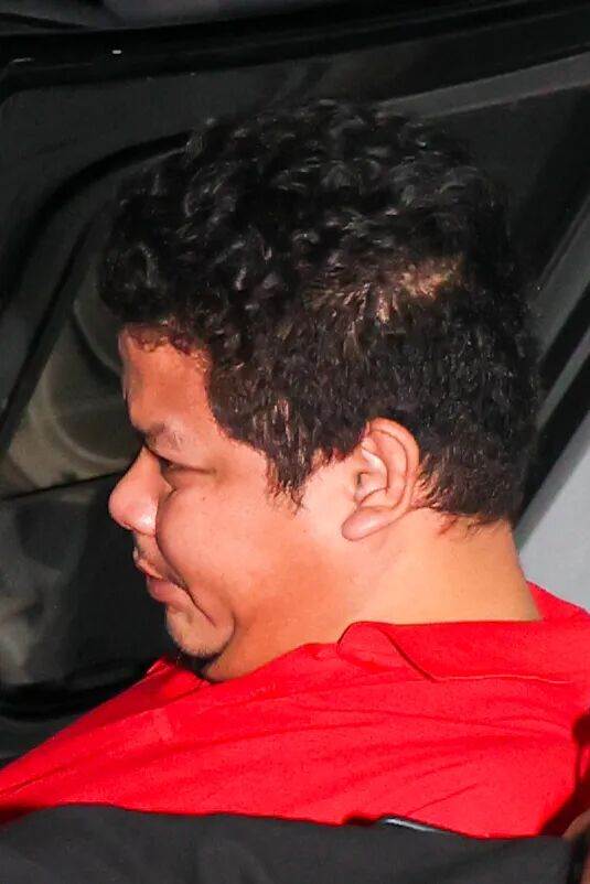 星期三(12月3日)早上9时10分左右,被告被警方押抵案发酒店,他身穿红色上衣,面无表情。