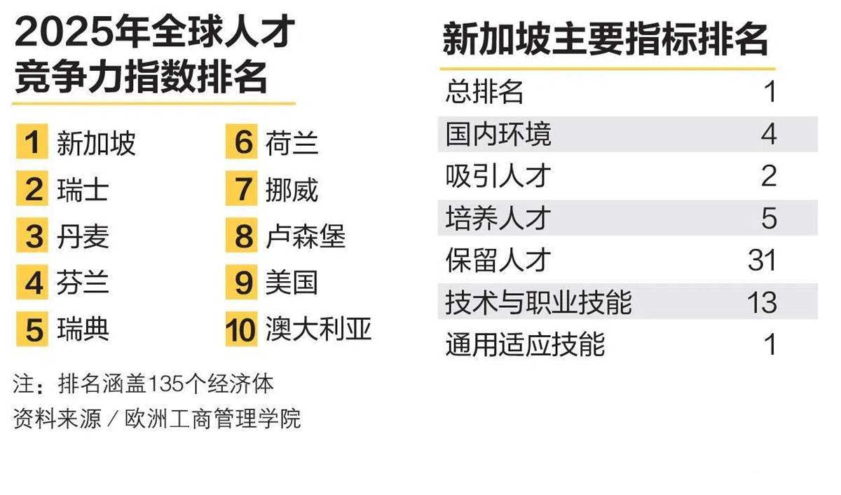 新加坡首次问鼎全球人才竞争力排行榜,取代多年领跑的瑞士。但新加坡留住人才的排名相对其他指标仍较低,且技术与职业技能排名跌出前十,显示中层劳动力在适应行业变化上存在隐忧。