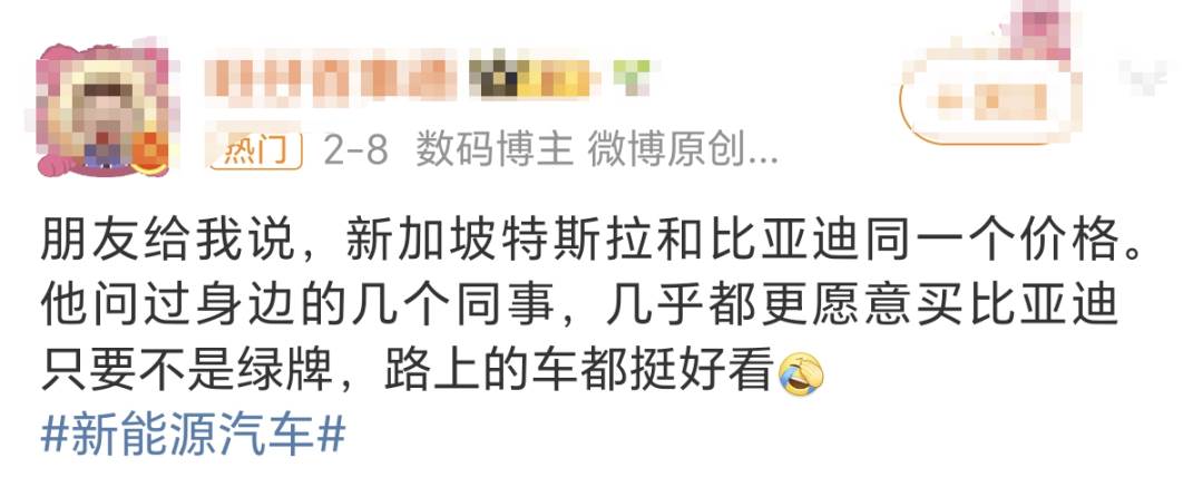 还有博主调侃说,他身边的几个新加坡同事,相比特斯拉更愿意选比亚迪。