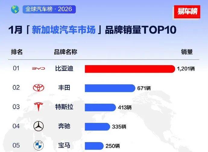 2026年1月新加坡汽车销量排名中,比亚迪以绝对压倒性优势拿下销冠!