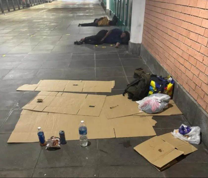 《新明日报》记者晚上走访现场时,发现有两人在地铁站闸门前方的空旷区域席地而睡,附近也可看到地上有数张纸皮,相信是有人准备铺在地上睡觉。