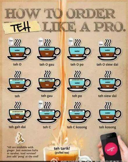 「Teh」一词是马来西亚国语「茶」之意,但走入传统咖啡店「喝茶」时,「Teh」不再只是「茶」了,当传统咖啡店掌柜的问:「要喝什么茶?」,这个问题的答案就是一整套的传统咖啡店点茶术语。