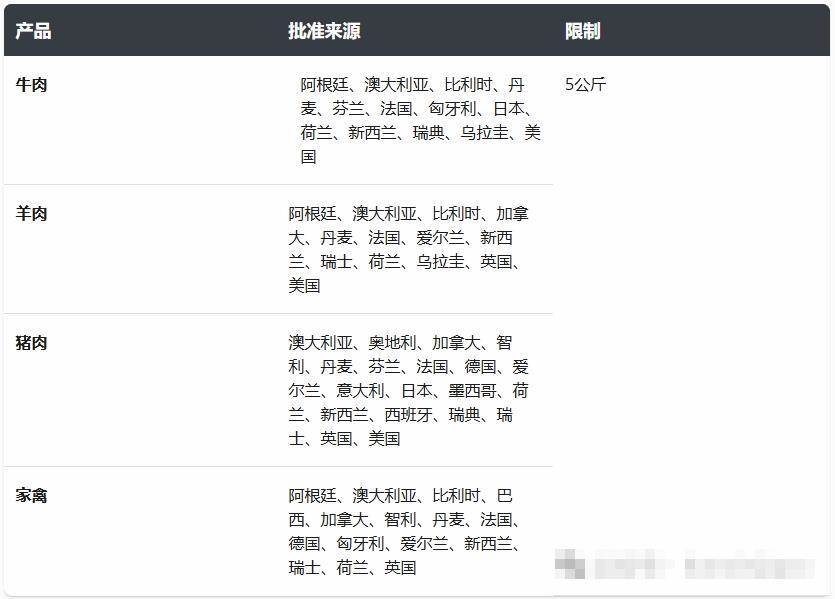 根据(SFA)3月25日发布的规定,入境新加坡时,每人最多可以携带5公斤的肉类(包括牛肉、羊肉、猪肉和禽类)。但前提是这些产品必须来自经新加坡批准的国家或地区,详情请见下表。