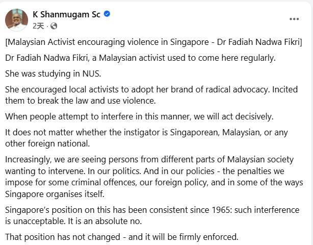 新加坡国家安全统筹部长兼内政部长尚穆根对此表示:“当有人试图以这种方式进行干预时,我们将果断采取行动,无论煽动者是新加坡人、马来西亚人,还是其他外国公民。”