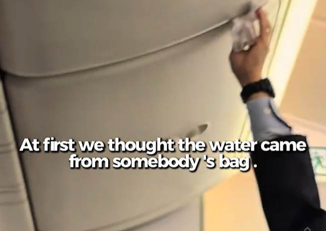 她的视频文案中写道,登机落座后,他们发现有水从头顶行李舱滴落,开始以为是某人的包里漏水了。