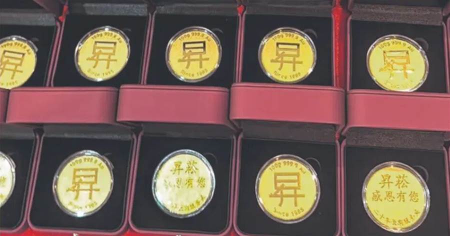 根据网上流传的照片,一张桌上放有约30枚重达100克的金币,正反面都刻上昇菘集团标志和“昇菘感谢有您”和“长期服务奖”等字样。