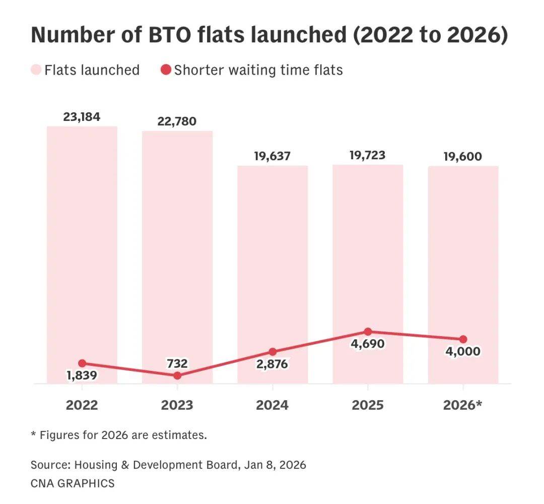 新加坡国家发展部长徐芳达于1月8日宣布,2026年将推出约19600套预购组屋(BTO),其中逾4000套单位等候时间少于三年。