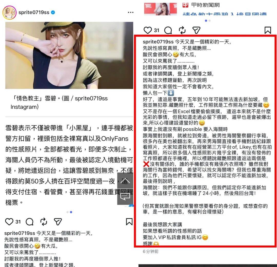 这名网红绰号“雪碧”,平时以大胆风格和性感形象走红。她表示去年自己受邀来新加坡观看F1夜间大奖赛,行程和目的都很单纯。没想到在入境柜台前,被执法人员拦下,带往二次审查室,最终被拒绝入境并遣返回台湾。