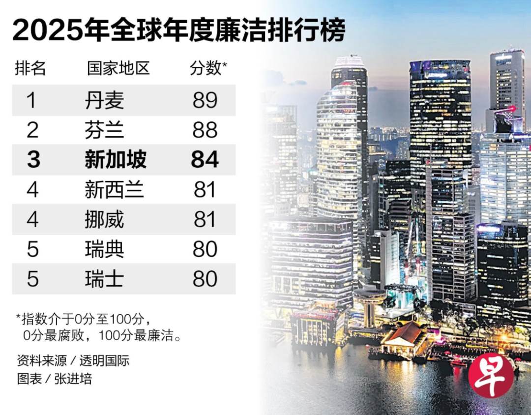 国际反贪组织“透明国际”(Transparency International)于2月10日公布《2025年度廉洁指数(CPI)》,新加坡再度以84分高分排名全球第三,并且连续第二年成为亚太区第一,清廉治理水平再获国际权威认可。