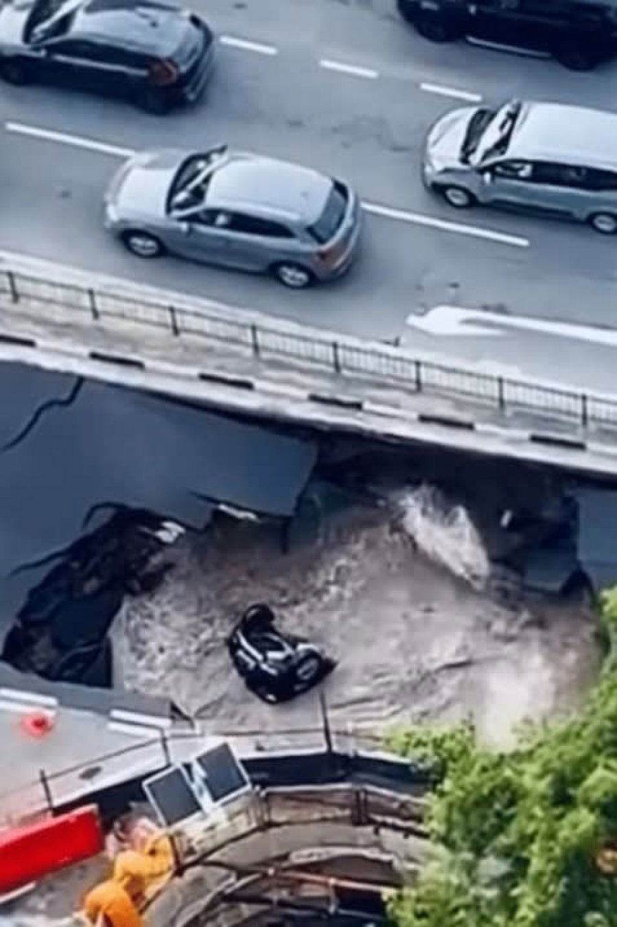 她的黑色马自达掀背车向左倾斜,惊恐万分的她跟着便连人带车掉进地洞里。