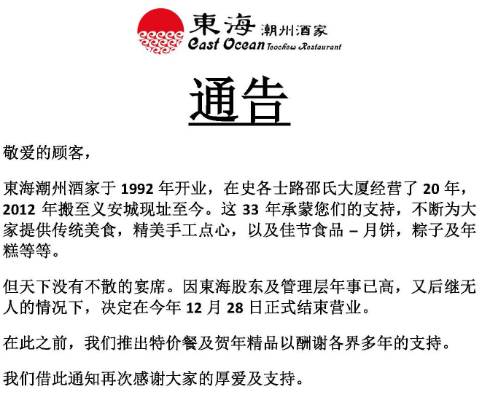 就在刚刚,连经营了33年的东海潮州酒家也官宣,将于12月28日正式结业,一代人的粤菜记忆即将落幕。