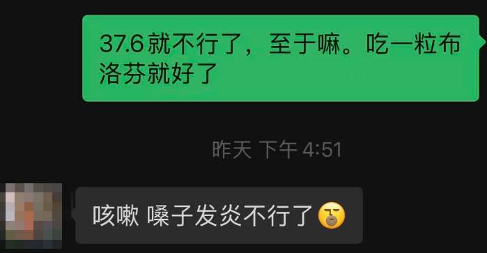 另一个朋友,上周也感冒了,先是发烧38度多、喉咙痛、咳嗽,嗓子发炎到说不出话。