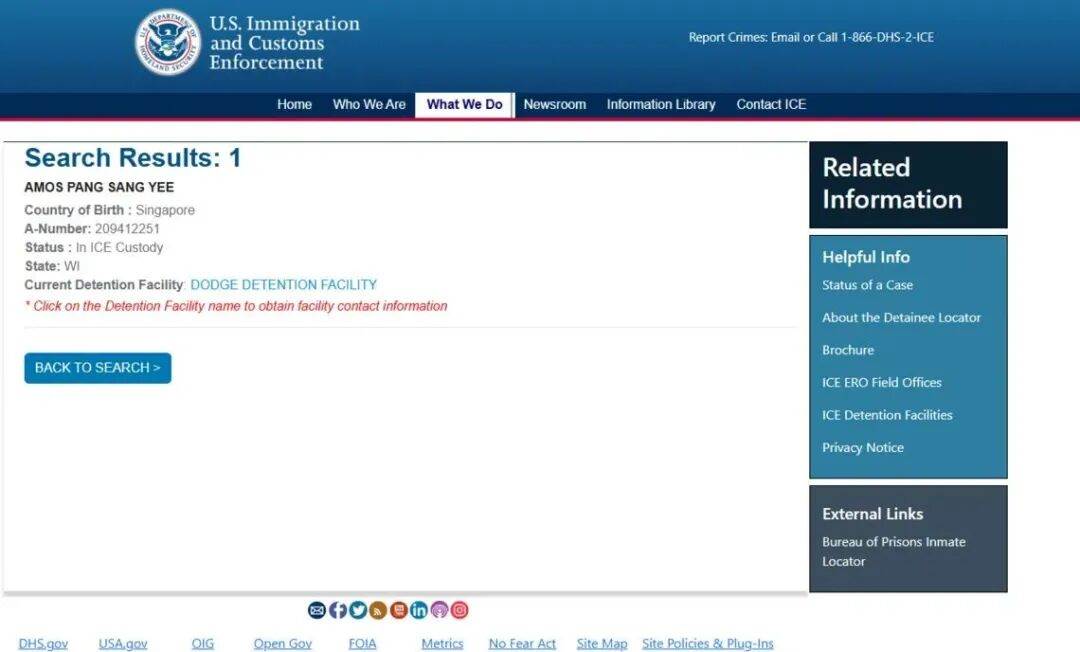 近日(11月24日),美国移民与海关执法局(ICE)官网显示,新加坡籍余澎杉(Amos Yee)再次被拘押。此前,他在11月20日结束了伊利诺伊州的刑期,并获得提前假释。对大多数非公民来说,被ICE拘押通常意味着可能面临遣返,或者庇护身份被重新审查。对余澎杉来说,这尤其关键——他当初是靠“受到政治迫害”的理由获得美国政治庇护,如今这一身份正面临动摇。