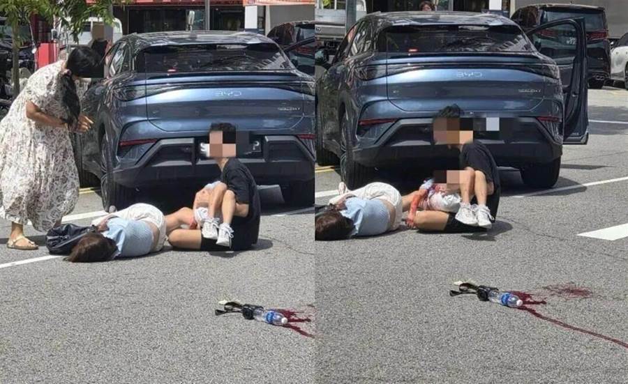 事发后,女童父亲抱着浑身是血的女童痛哭,频频向周围人喊“please”求助。女童的脸上和衣服沾满了血迹,母亲则躺在马路上,意识清醒。