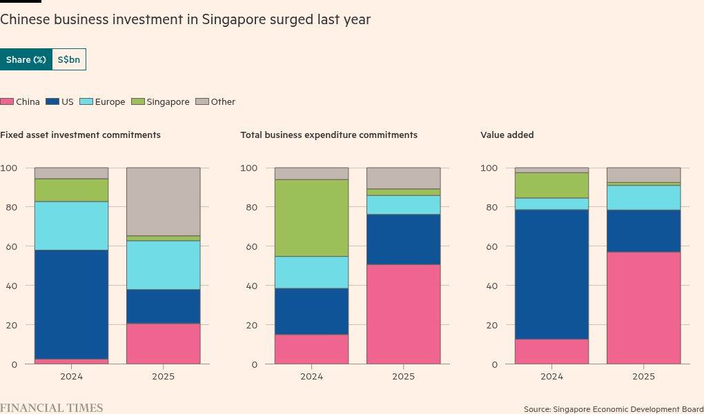 来自中国大陆的固定资产投资金额从3.4亿新元飙升至29.3亿新元,一年涨了8倍不说,还占了新加坡吸引外资总额的20.6%(前年只有2.5%)。