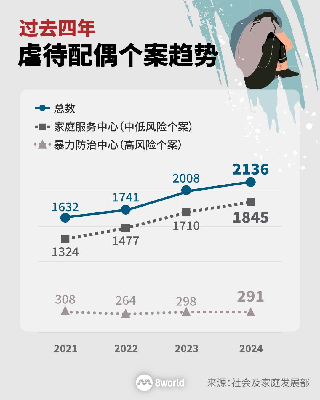 数据显示,去年由家庭服务中心和暴力防治中心等社区机构处理的虐待配偶个案达到2136起,比2023的2008起多出逾6%。