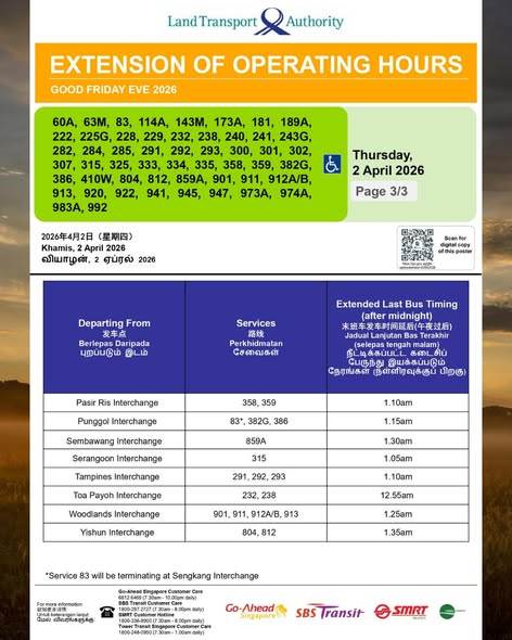 每逢节假日前夕,新加坡公共交通系统都会适时调整运营安排。今年耶稣受难日(4月3日)前夕,地铁与巴士服务将再次延长运营时间,延续近年来公交业者在公共假期前夜为公众提供便利的惯例。