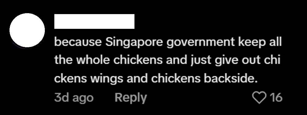 “因为新加坡政府把鸡只都收起来了,只给人们鸡翅膀和鸡屁股。”
