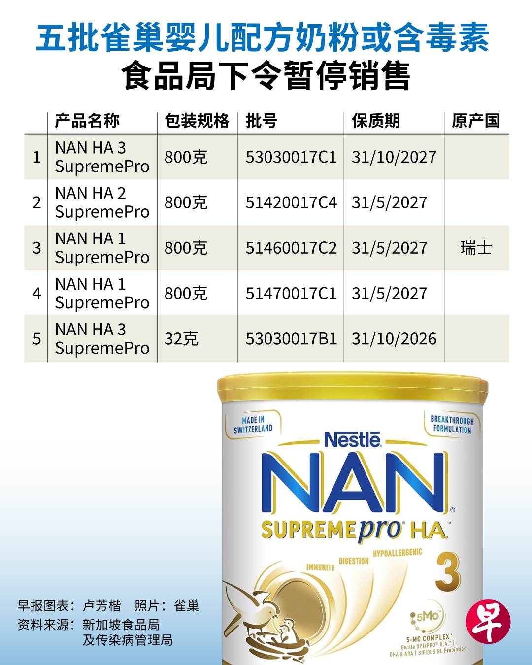 根据文告,受影响的五批奶粉都产自瑞士,包括800克的NAN HA 3 SupremePro(批号53030017C1,2027年10月31日过期)、NAN HA 2 SupremePro(批号51420017C4,2027年5月31日过期)、NAN HA 1 SupremePro(批号51460017C2和51470017C1,2027年5月31日过期),以及32克的NAN HA 3 SupremePro(批号53030017B1,2026年10月31日过期)。