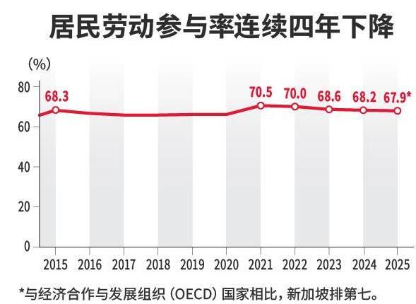 尽管收入水平提升,新加坡15岁及以上居民的劳动参与率却从去年的68.