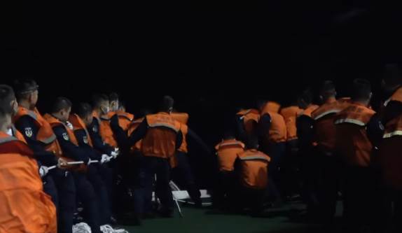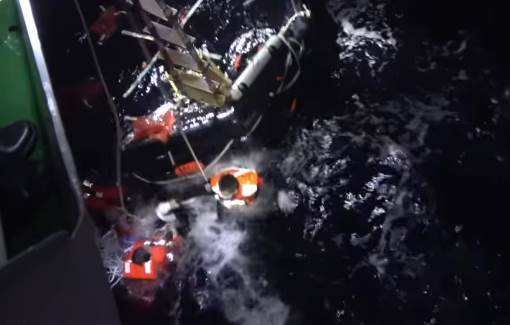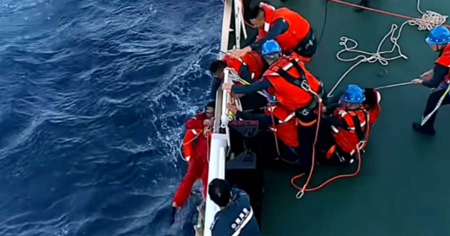 深夜海域风浪汹涌,救援环境极为恶劣。中国救援队在4米高的浪涌中艰难航行,救援人员顶着8级风浪,在浪涌交汇的危险区域成功营救多名落水船员。
