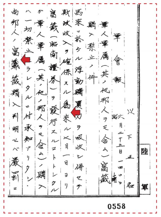 因此,1942年6月25日,日军匆忙发出“军人及家属禁止购买富签”(日文,“富签”即彩票)的通知。这个通知右起第5行至第7行清楚写明“为了吸收马来(即星马)的浮动购买力而发行昭南证券”;而左起第3行则写明“军人和军人家属(和其他日本人)一律禁止购买。