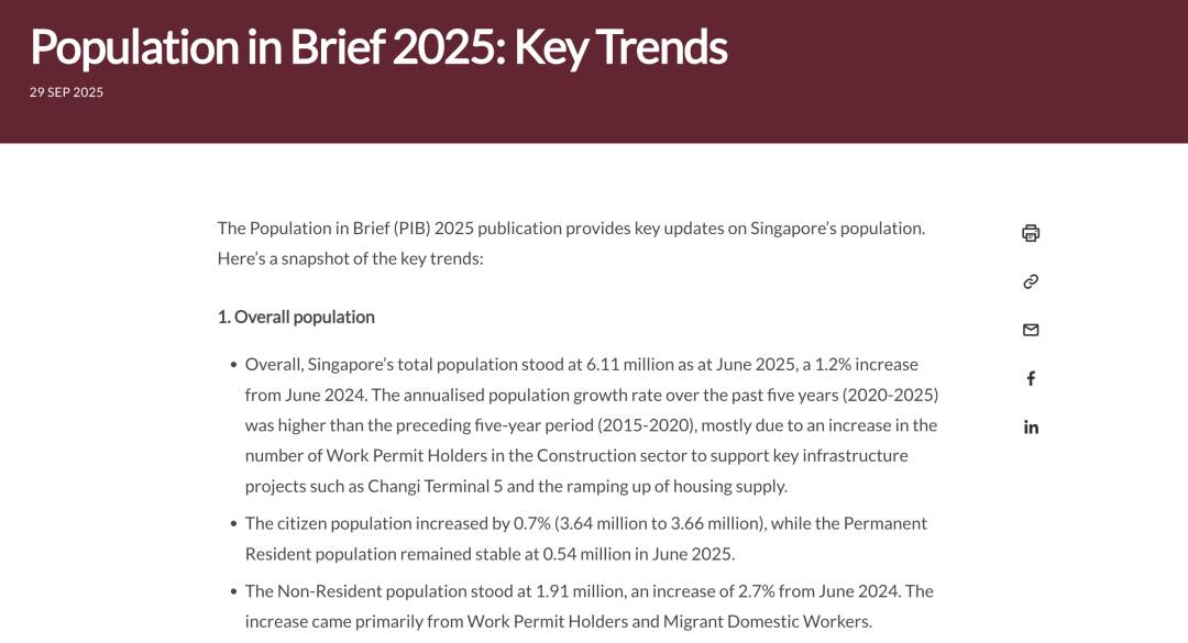 根据最新的《2025 年人口简报》,截至今年6月,新加坡总人口约611万,同比增长约1.2%。其中,非居民人口增速最快,增加约1.91万,占总人口的31%以上;相比之下,本地公民人口只增加约3.66万,增长率不到1%。这意味着,新加坡的人口增长越来越依赖外来人口。
