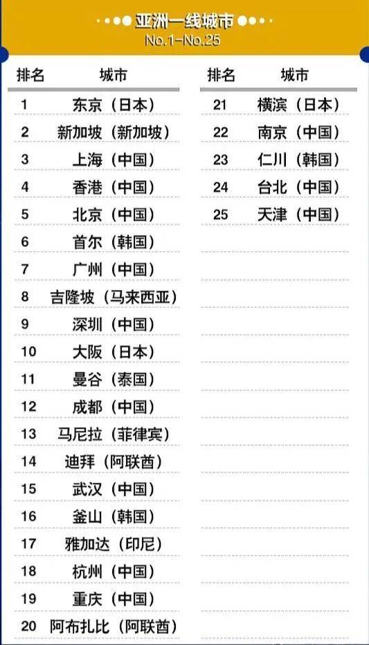 从入围的25个城市来看,大多数都是首都或者区域经济发展中心。其中中国城市占比最多,足有12个,分别是上海、香港、北京、广州、深圳、成都、武汉、杭州、重庆、南京、台北、天津,可谓“半壁江山尽归我”。