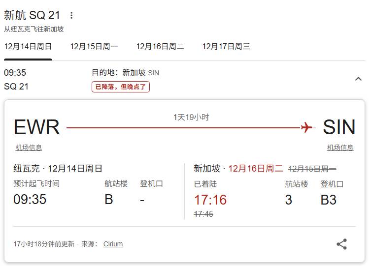 好不容易盼到最新计划:新航班定于当地时间16日早上9点35分从纽瓦克机场起飞,要是顺利的话,新加坡时间17日下午4点39分能到。