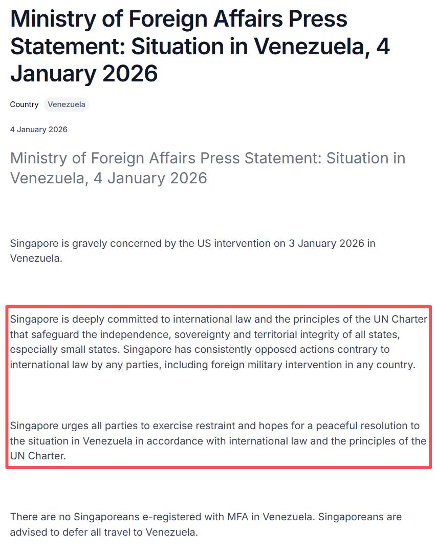 新加坡外交部也在日前发表声明,对委内瑞拉局势表示严重关切,并反对任何违反国际法、对他国进行军事干预的行为。