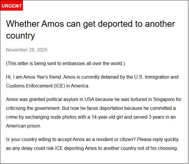 求助信是11月26日发布的,信中写道:“你们国家愿意接收Amos成为居民或公民吗?请尽快回复,任何延误都可能导致ICE将他遣返至非他所愿的国家。”