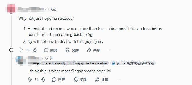 不少新加坡网友反而“支持”这封求助信,因为他们不想让余澎杉回来继续霍霍新加坡。