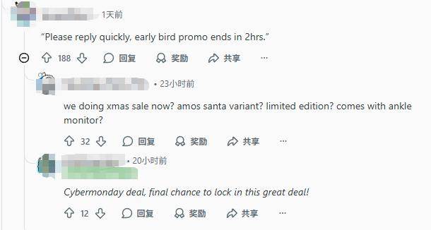 也许是他朋友撰写的那句“Please reply quickly”(请尽快回复)与近期黑五的商家推广文案产生了奇妙的关联,以至于被营销文案洗脑的网友张口就来: