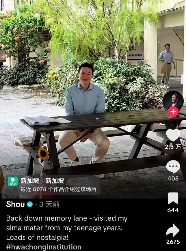 上周,现年42岁的TikTok全球总裁周受资回到自己的母校——新加坡的华侨中学,并在TikTok发布了一段短视频,带大家重走他30年前走过的校园小路,引发全网热议。