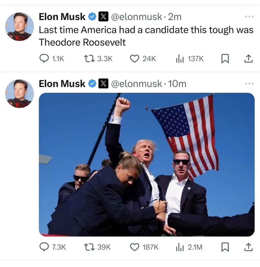 马斯克也公开表示,特朗普是罗斯福后的又一个美国硬汉。
