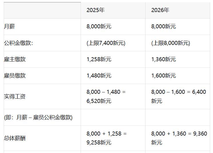以一名在2026年年龄在55岁及以下、月收入8000新元的员工为例,2026年新政落实后的变化如下: