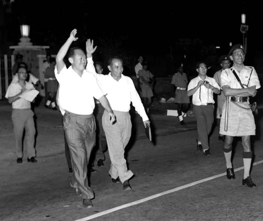 1963年9月21日,新加坡举行第二届立法议院选举。图为李光耀(挥手者左)与吴庆瑞(右)向聚集在计票站的群众挥手示意。 (档案照片)