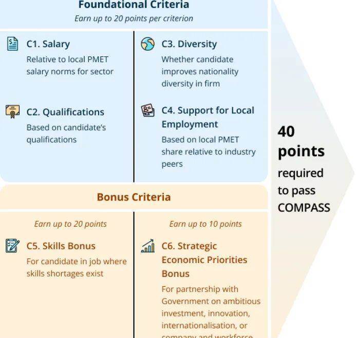 2、雇主公司资质公司需具备良好经营记录、稳定财务状况与合理员工结构具备长期支付薪资能力与真实业务的公司,成功率更高3、Compass评分超过40评分分为6个维度,如果不是特殊稀缺职业,则需从薪资、学历、公司内部国籍多元化、本地员工占比四个维度来凑分