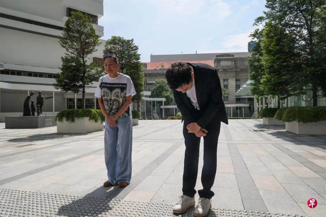 前艺人方威捷(右)6月16日上午抵达国家法院准备入狱服刑,并在庭外鞠躬向受害人道歉。左为他的母亲。 (张俊杰摄)